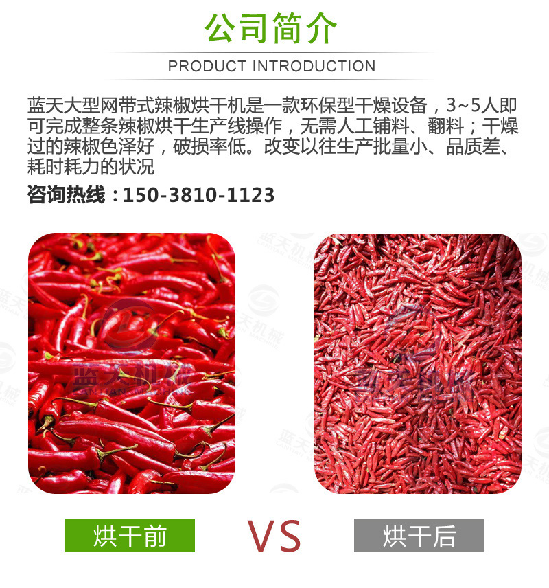 藍天大型網(wǎng)帶式辣椒烘干機是一款效率高,對環(huán)境有保護的辣椒烘干設備,3-5人即可完成整條辣椒烘干機設備生產線操作,無需人工鋪料、翻料;烘干過的辣椒色澤好,破損率低。這種全自動大型辣椒烘干機改變了以往生產批量小、品質差、耗時耗力的狀況,是產量大用戶的很好一個選擇。